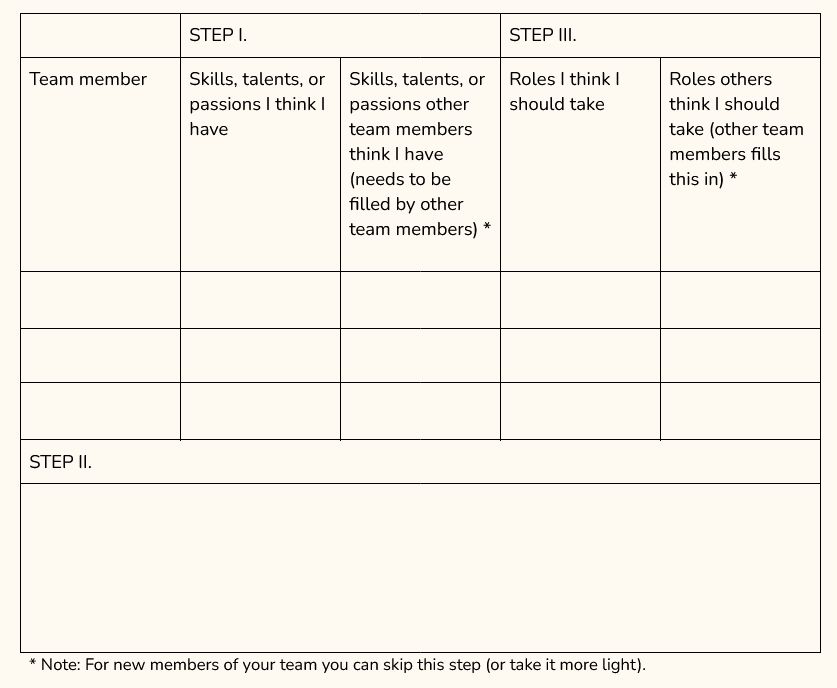 • Step III. - You and your team members are filling in the table about your team roles by matching in the skills, talents and passions of each person to a fitting role (merge information from step I. and II.).